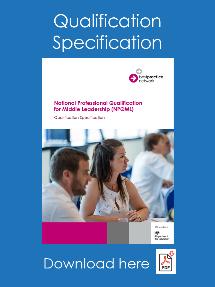 The National Professional Qualification for Middle Leadership (NPQML) is accredited by the UK Department for Education (DfE). The qualification is delivered by Best Practice Network, a provider of UK accredited qualifications for education professionals worldwide.