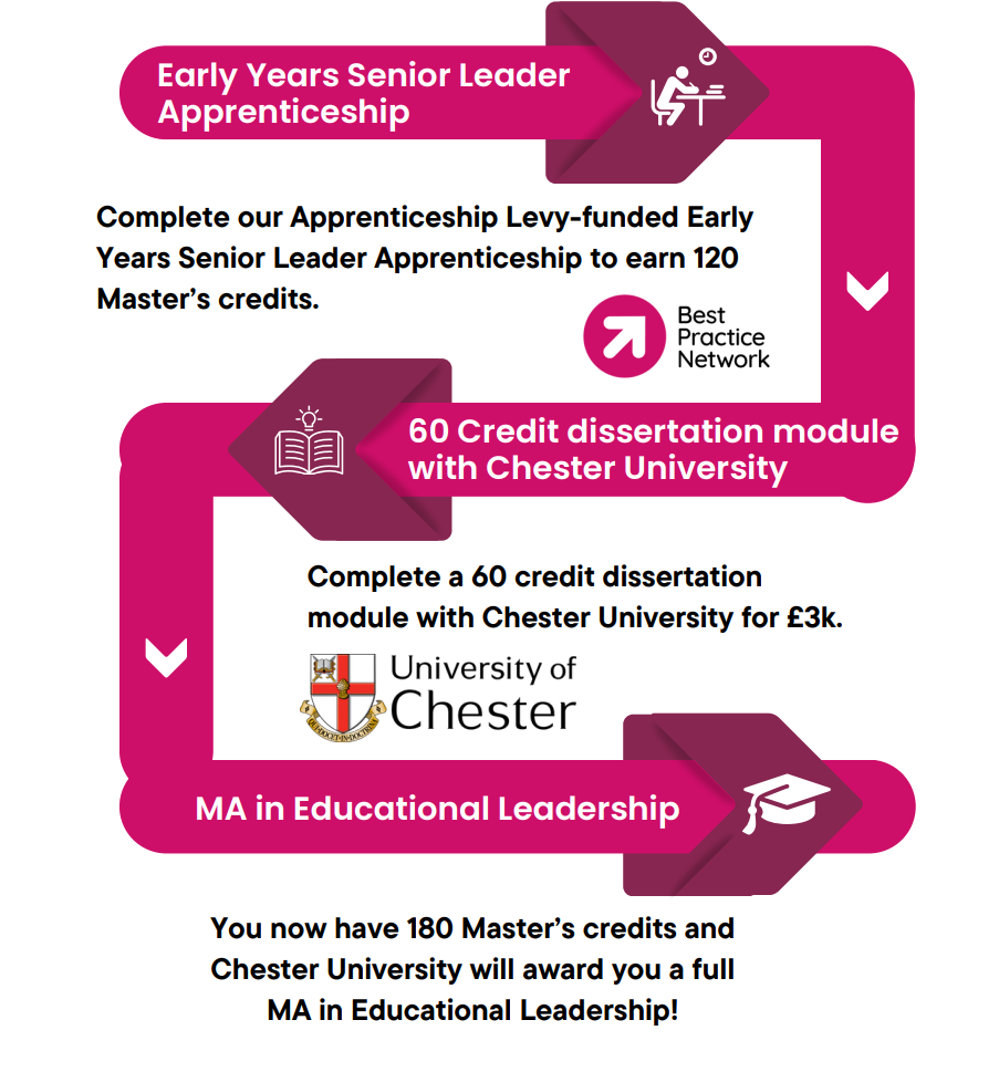 The Early Years Senior Leader Apprenticeship is already taught at master’s level, and this is formally recognised by the University of Chester. That means your hard work on the apprenticeship doesn’t just stand alone — it also counts directly towards a full master’s degree.