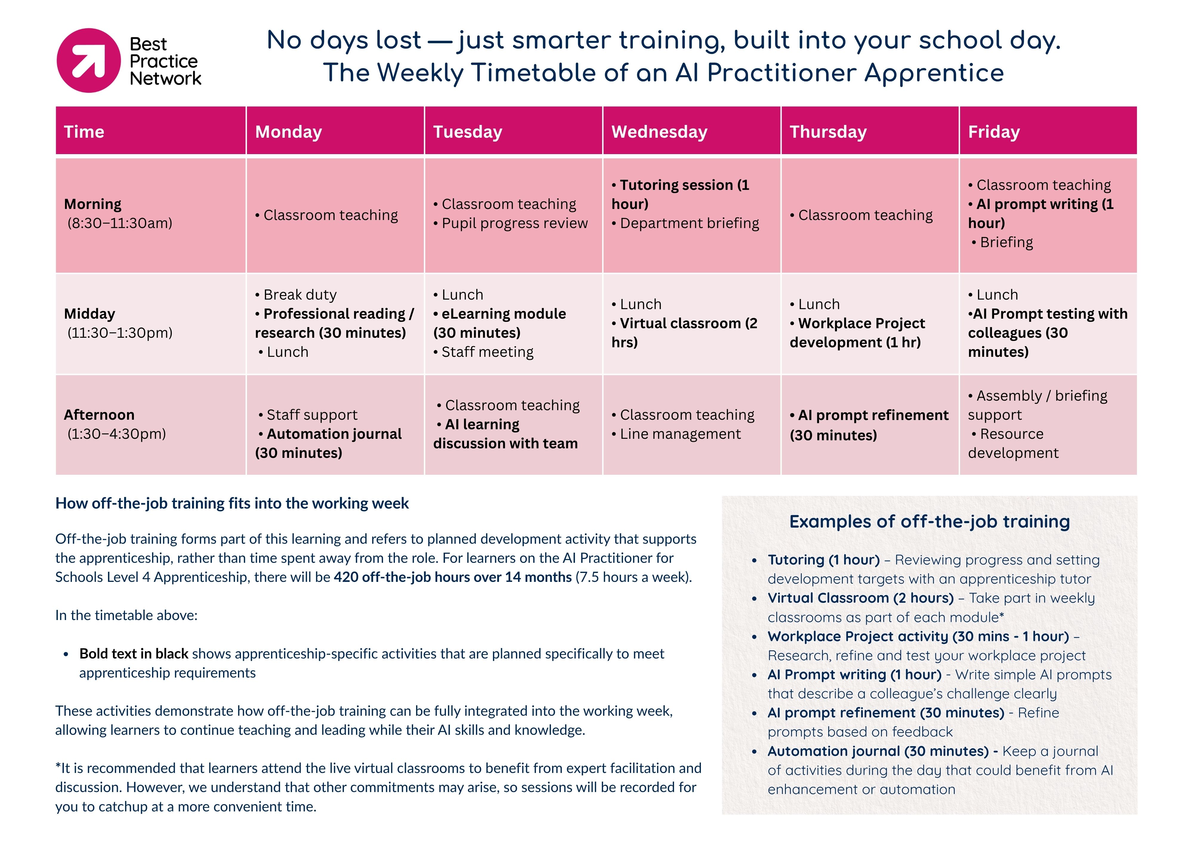 Examples of off-the-job training include coaching or mentoring sessions, formal training events, project work, reflective learning, research, shadowing, interactive online modules, networking, and skill development activities.