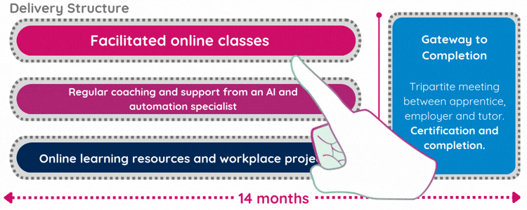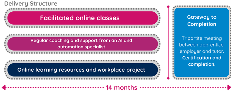 The AI Practitioner for Schools Apprenticeship is delivered over 14 months through a blended model that combines live online learning, specialist coaching and a substantial workplace project. Learning and assessment are fully integrated, meaning apprentices demonstrate competence through real work carried out in their school or trust rather than a separate end-point assessment.