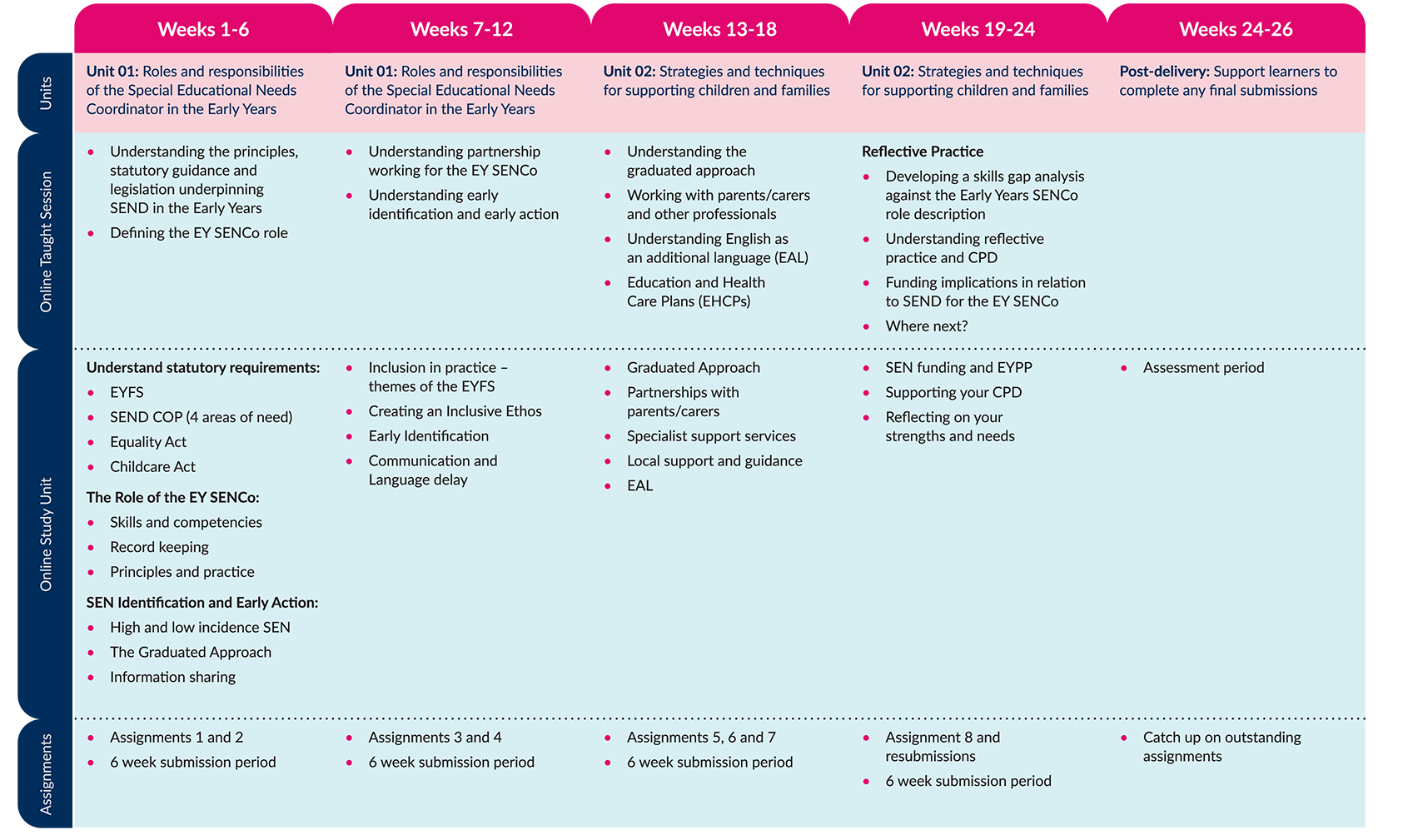 The Level 3 Early Years SENCO qualification is delivered over 6 months through Online Taught Sessions and Online Study Units.