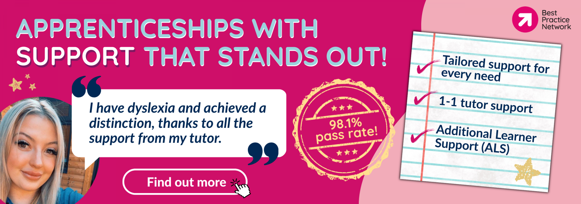 At Best Practice Network, our tutors are with apprentices every step of the way. They provide personalised 1:1 guidance, adapting to each learner’s needs and building strong, supportive relationships. With smaller caseloads than many providers, our tutors have the time to focus on what matters most — helping every apprentice feel confident, cared for and ready to succeed.