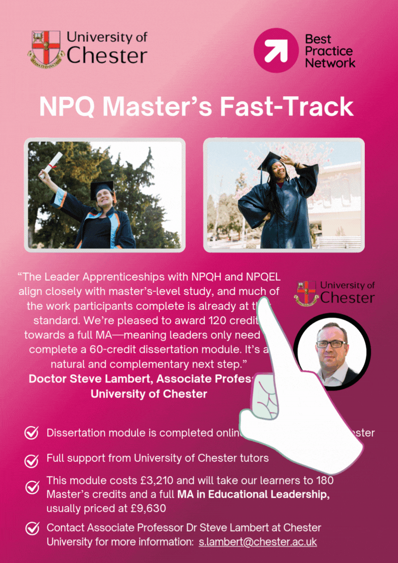And because most of the learning takes place within the Level 7 Leader Apprenticeship with NPQ, very little additional study is needed. It’s a straightforward, affordable route to a full Master’s degree—with high-level leadership development at its core.