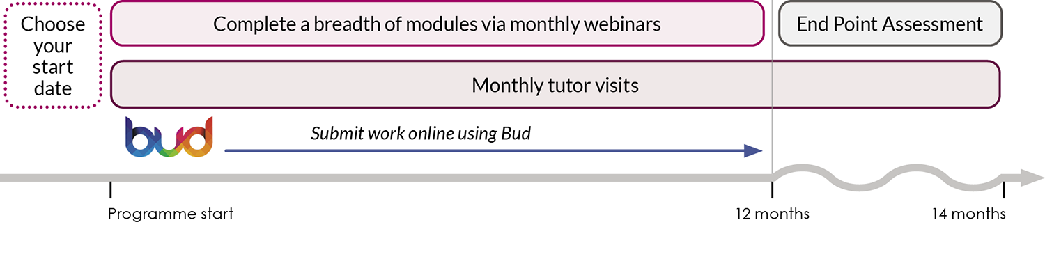 Delivery will also be through webinars, online courses and face to face training days with the dedicated apprenticeship tutor (dependant on current legislation).