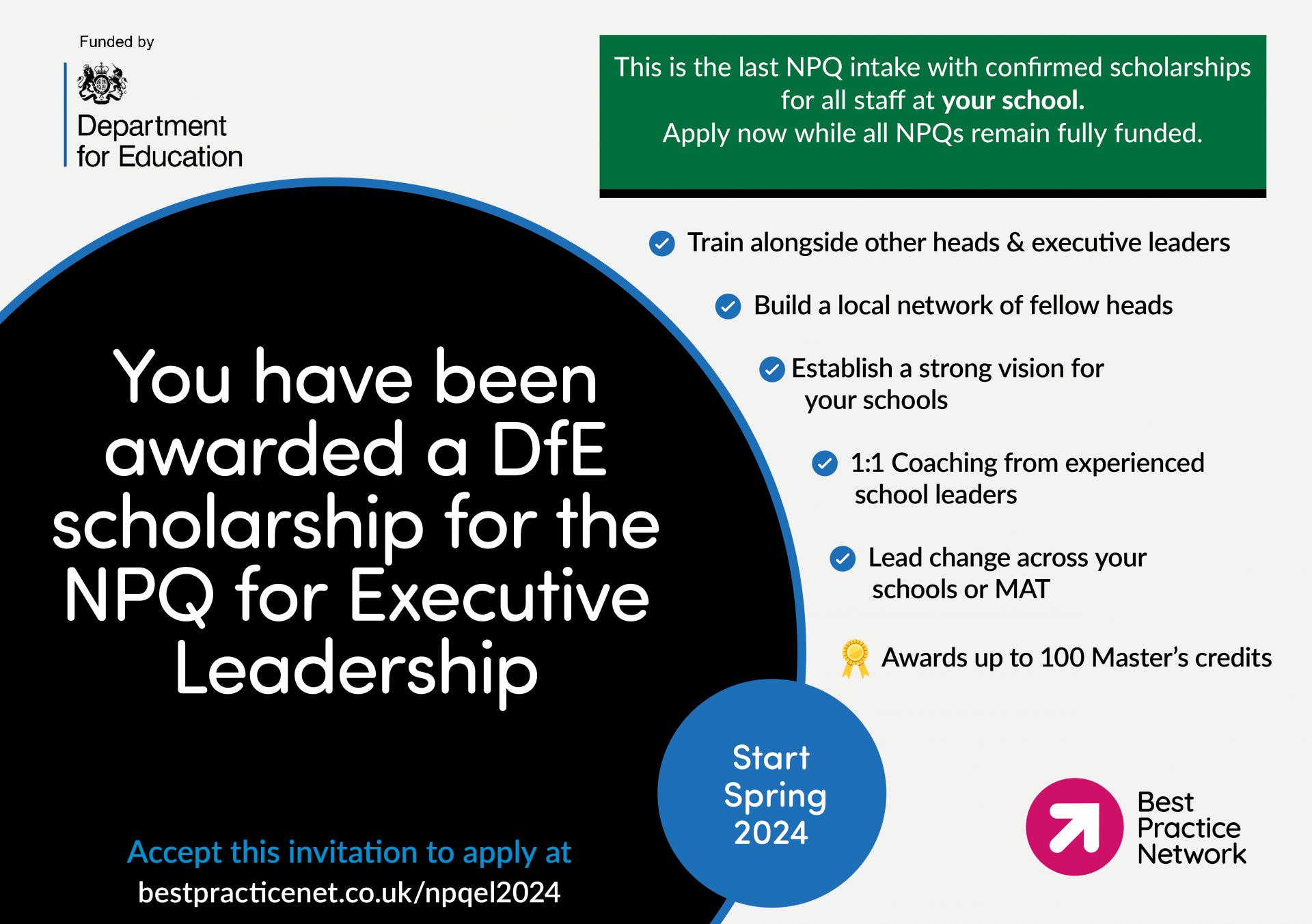 The Department for Education has confirmed that it will fully fund your place on the NPQEL Spring 2024 Intake.